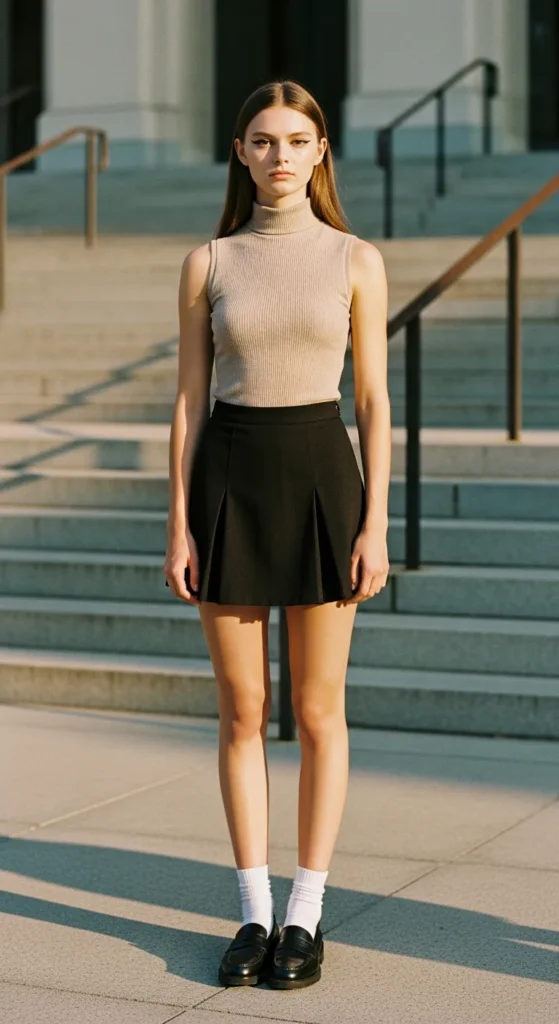 A sleeveless mock neck top looks sleek and structured, especially when paired with a flowy pleated mini skirt. It feels slightly preppy but still fresh for summer.