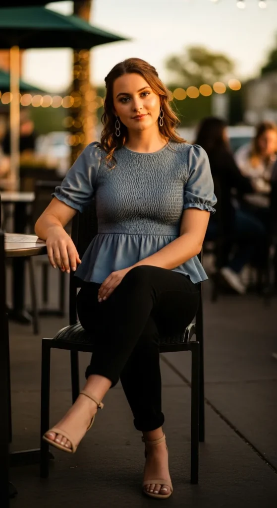 A smoked peplum top gently defines the waist while staying airy. Paired with slim ankle jeans, it feels flattering and ideal for both classes and casual evenings.
