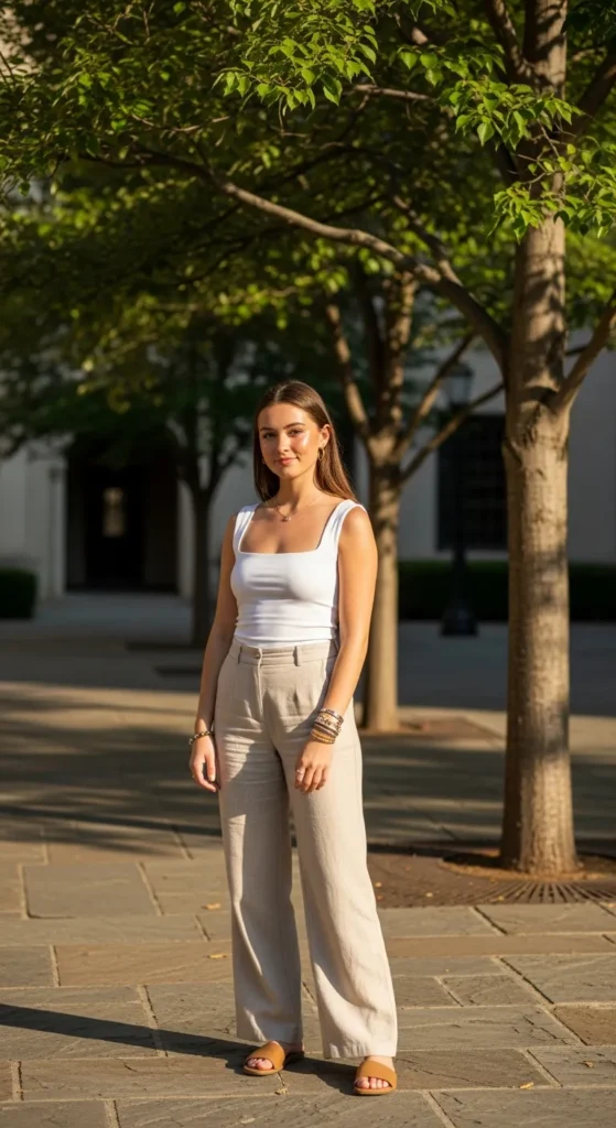 A square-neck fitted top frames the collarbones beautifully. Styled with breezy linen pants, it feels airy, mature, and perfect for hot summer afternoons.