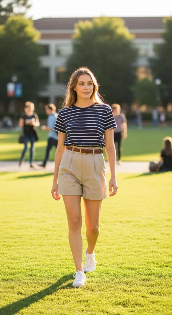 A striped boxy tee brings effortless summer charm. Combined with tailored high-waisted shorts, it blends relaxed and refined for busy campus schedules.