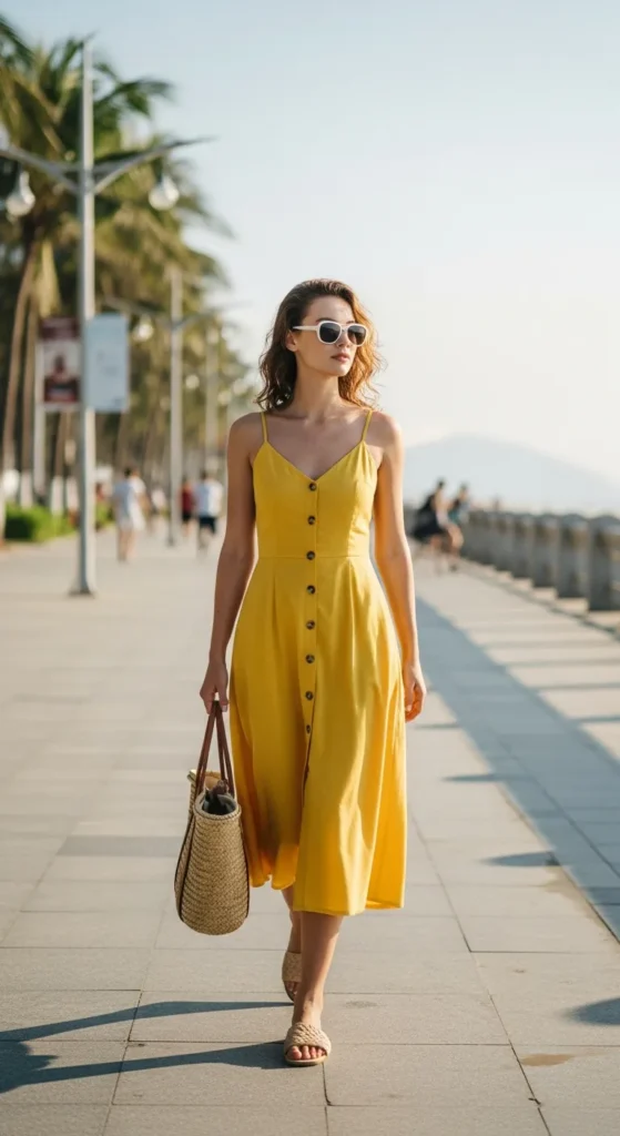 A cheerful yellow button-front sundress pairs beautifully with a straw tote bag for casual daytime adventures and seaside strolls.