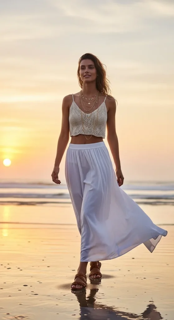 A delicate cream crochet crop top paired with a lightweight flowing skirt feels boho-chic while staying cool. Perfect for sunset photography.