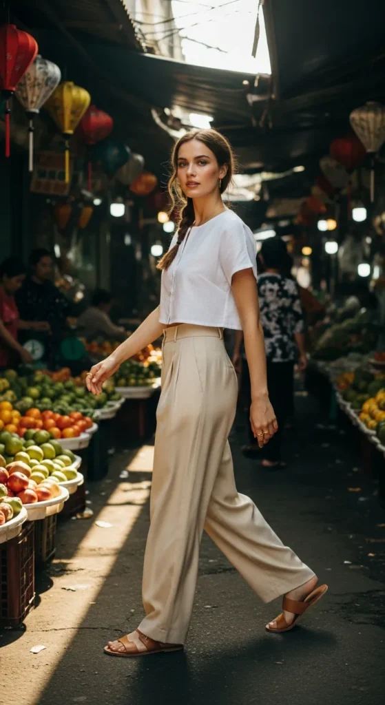 Crisp white cropped linen blouse with high-waist wide-leg pants in pale sand balances elegance and comfort for warm city streets.