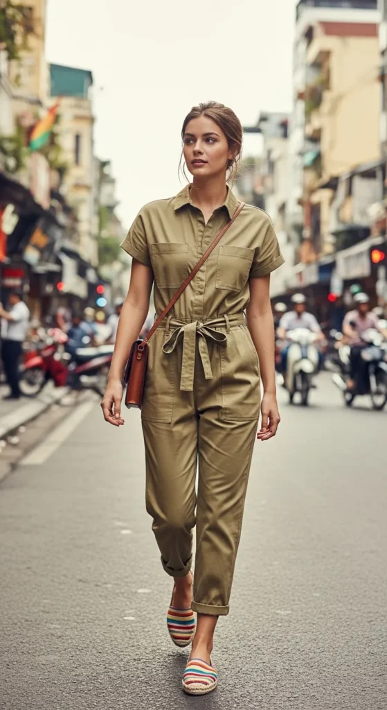 A soft cotton jumpsuit in light khaki keeps you cool while giving off an effortless, traveler-chic vibe. Add colorful espadrilles for playful summer energy.