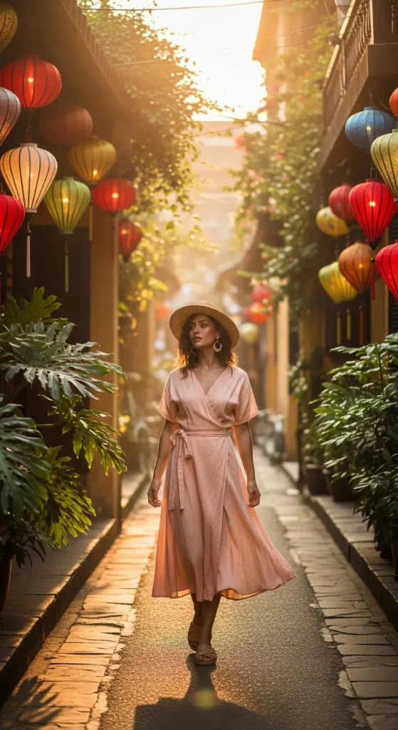 A soft linen wrap dress in pastel peach catches the tropical breeze perfectly. Paired with a wide straw hat, it’s a relaxed yet chic choice for exploring Hoi An’s lantern streets.