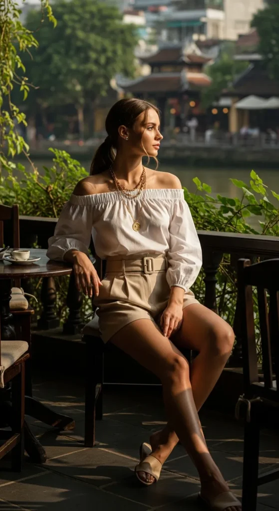 An ivory off-shoulder cotton blouse paired with beige high-waist shorts offers casual yet feminine charm. Perfect for café hopping or walking along the riverside.
