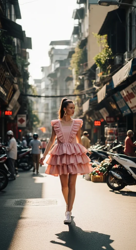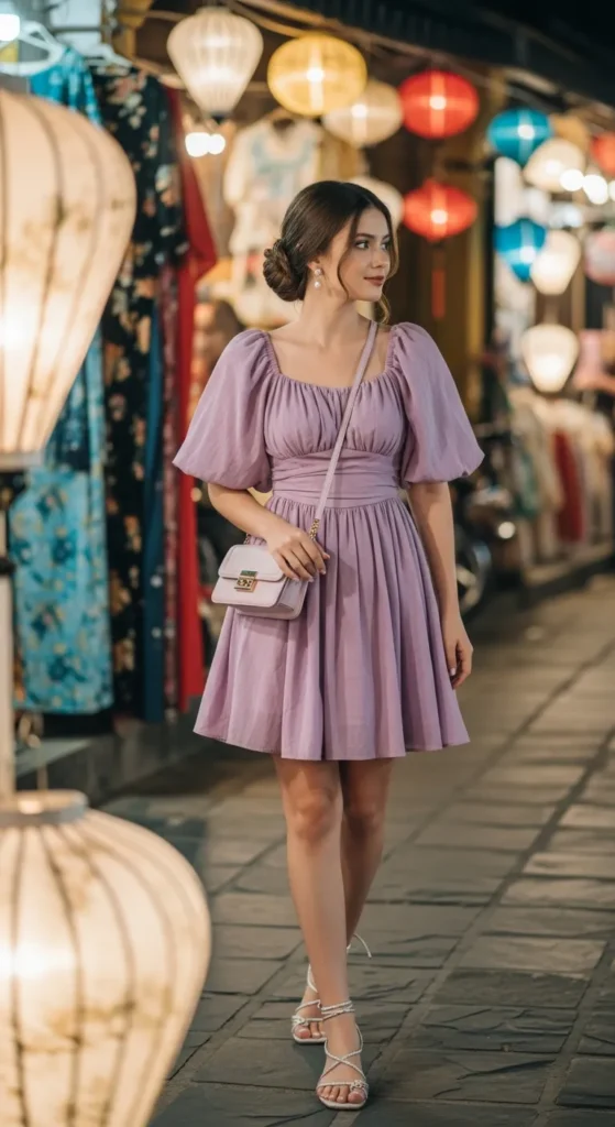 A soft lilac puff-sleeve mini dress radiates playful elegance. Paired with strappy sandals, it’s ideal for evening market strolls.