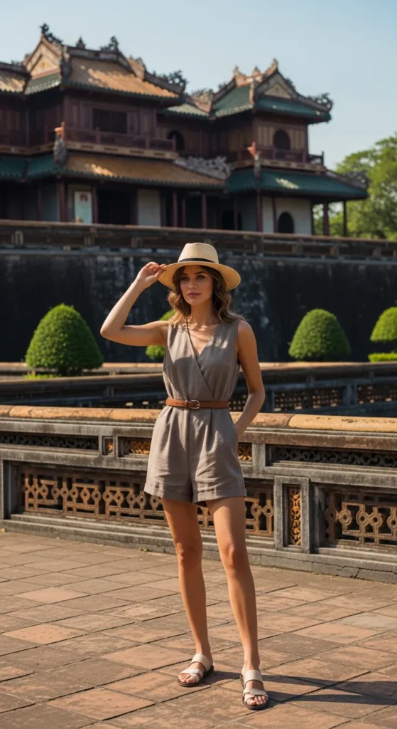 A taupe sleeveless linen romper with a straw fedora balances cool minimalism and practical sun protection. Perfect for tropical sightseeing.