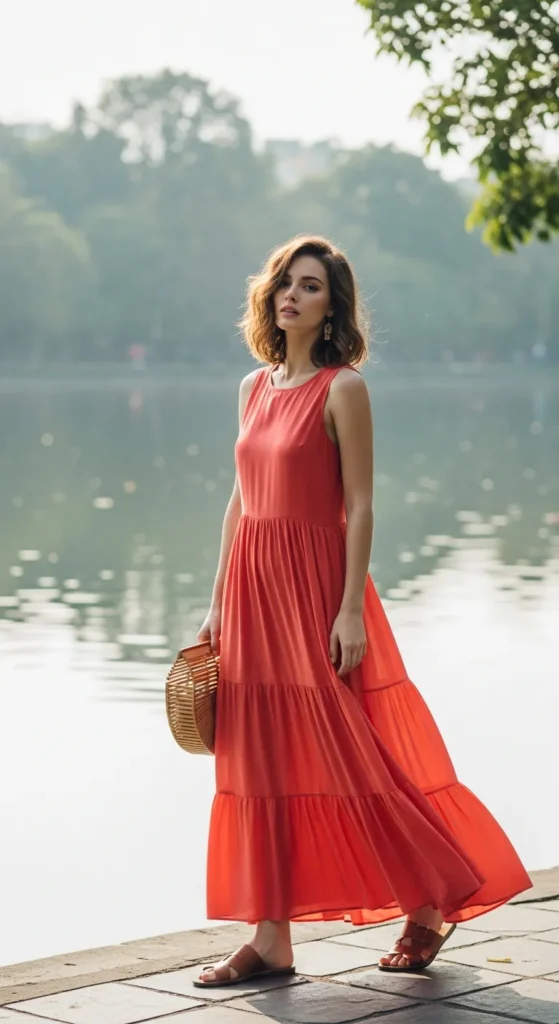 Flowing tiers in soft coral capture movement with every step. Paired with a round bamboo bag, this outfit is perfect for lakeside strolls or market mornings.