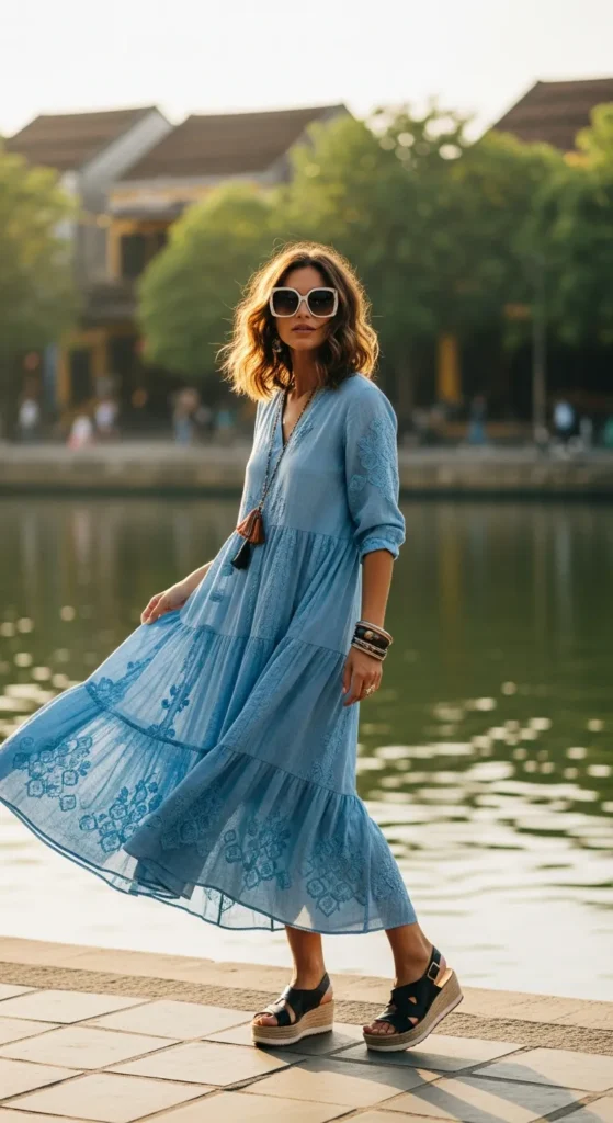 A sky-blue tiered midi dress flows beautifully in the wind. Platform sandals keep height without compromising comfort for walking and sightseeing.