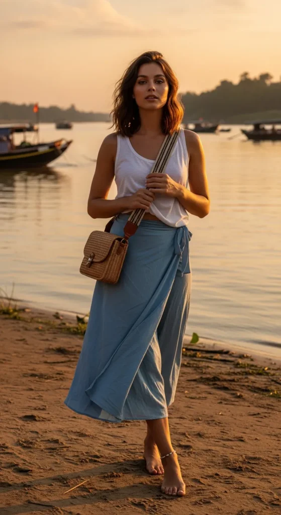 A light blue wrap skirt paired with a white cotton tank creates effortless motion with each step while staying breezy. Ideal for riverside walks.