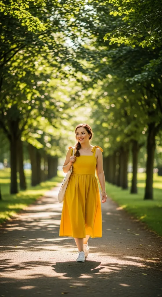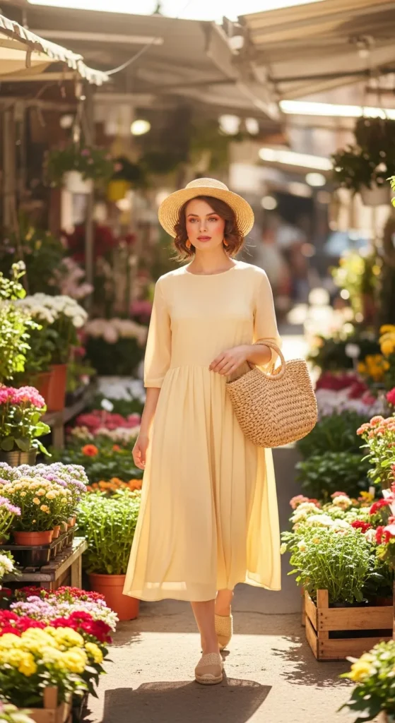 A soft butter-yellow midi dress instantly feels romantic and summery. The flowing silhouette moves beautifully in warm breezes, making it perfect for brunch dates, outdoor markets, or afternoon strolls in the sun.