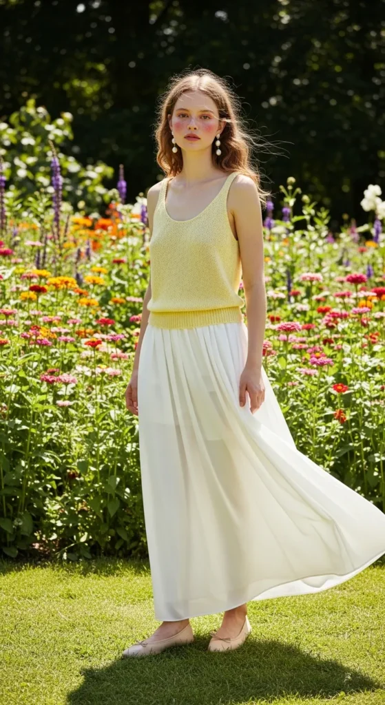 A pastel yellow knit tank paired with a breezy white maxi skirt creates a soft, dreamy summer look. The fitted knit texture balances the movement of the skirt, giving the outfit an elegant yet relaxed feel.