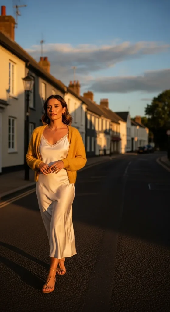 Layering a lightweight yellow cardigan over a white slip dress creates a delicate summer look that feels cozy yet fresh. The soft color contrast adds warmth while keeping the outfit airy.