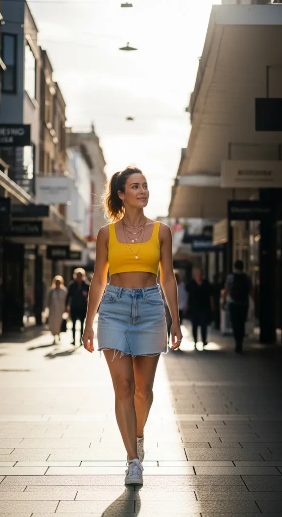 A cheerful yellow crop top paired with a light-wash denim skirt gives off effortless summer energy. The bright top adds personality while the denim keeps the outfit grounded and wearable for everyday outings.