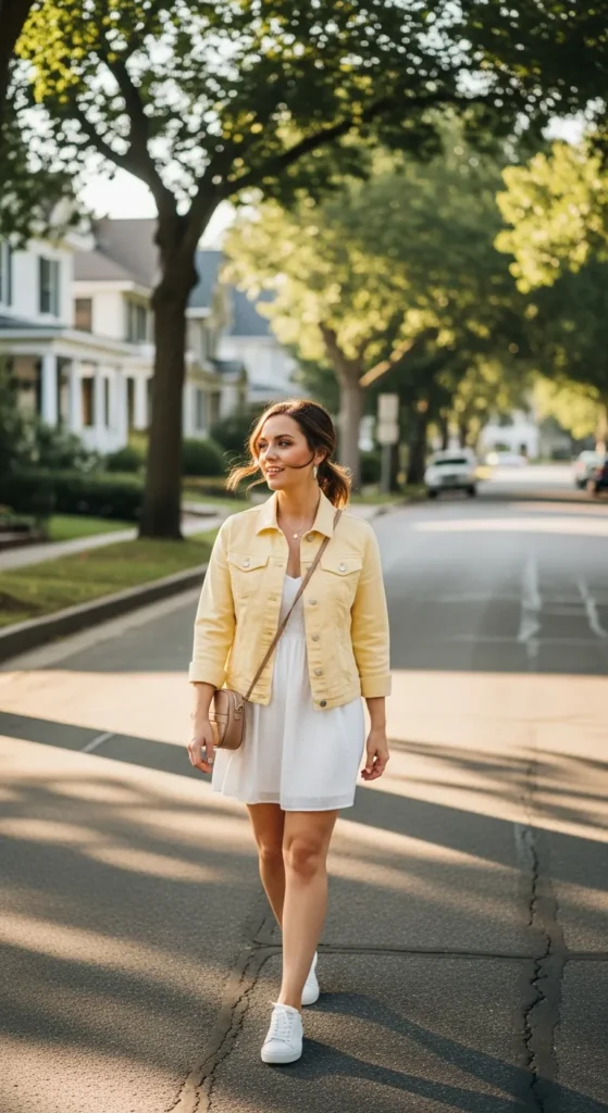 A light yellow denim jacket layered over a white summer dress creates a cheerful and versatile outfit. The jacket adds structure while the dress keeps the look soft and feminine.