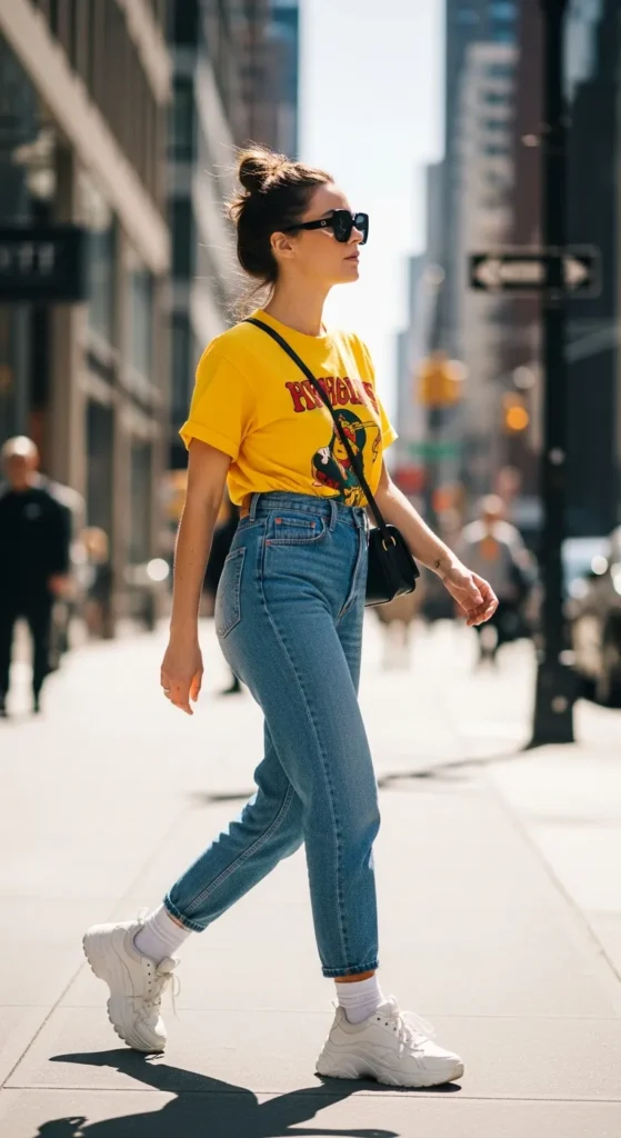 A playful yellow graphic tee paired with relaxed blue jeans creates the perfect casual summer outfit. The contrast between bold color and classic denim feels youthful, comfortable, and effortlessly cool for everyday errands or coffee runs.
