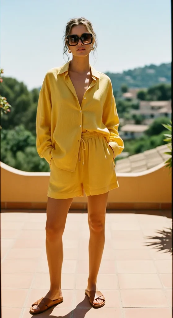 A yellow linen matching set with a relaxed shirt and shorts creates a modern, effortless summer outfit. The coordinated look feels stylish without trying too hard and keeps you cool on warm days.