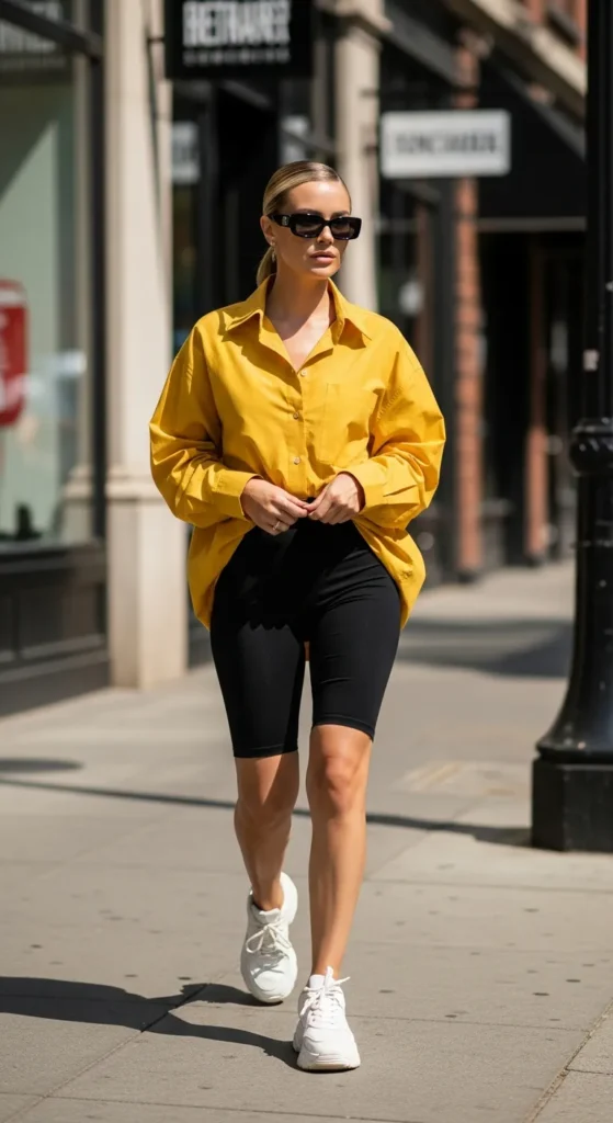 An oversized yellow button-up shirt worn over black biker shorts creates a relaxed streetwear-inspired summer outfit. The loose fit adds comfort while the bold color makes the look stand out.