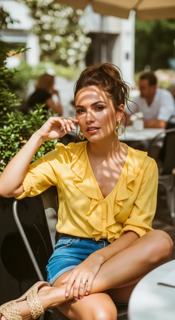A playful yellow ruffle top instantly adds movement and charm when paired with classic denim shorts. The combination feels lighthearted and perfect for warm sunny afternoons.