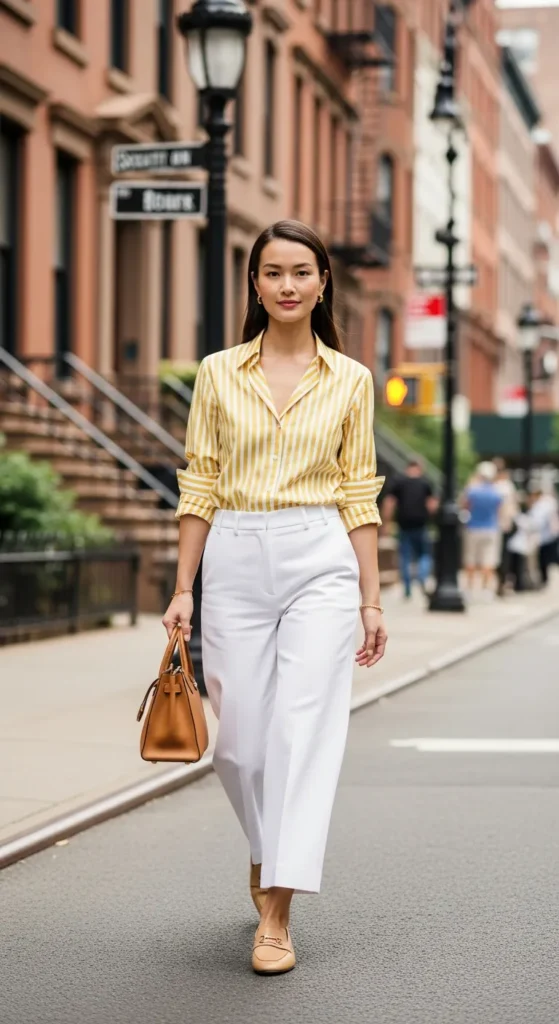 A yellow striped button-down paired with white wide-leg pants creates a crisp summer outfit that feels bright and tailored. The stripes add interest while the relaxed pants keep it comfortable.