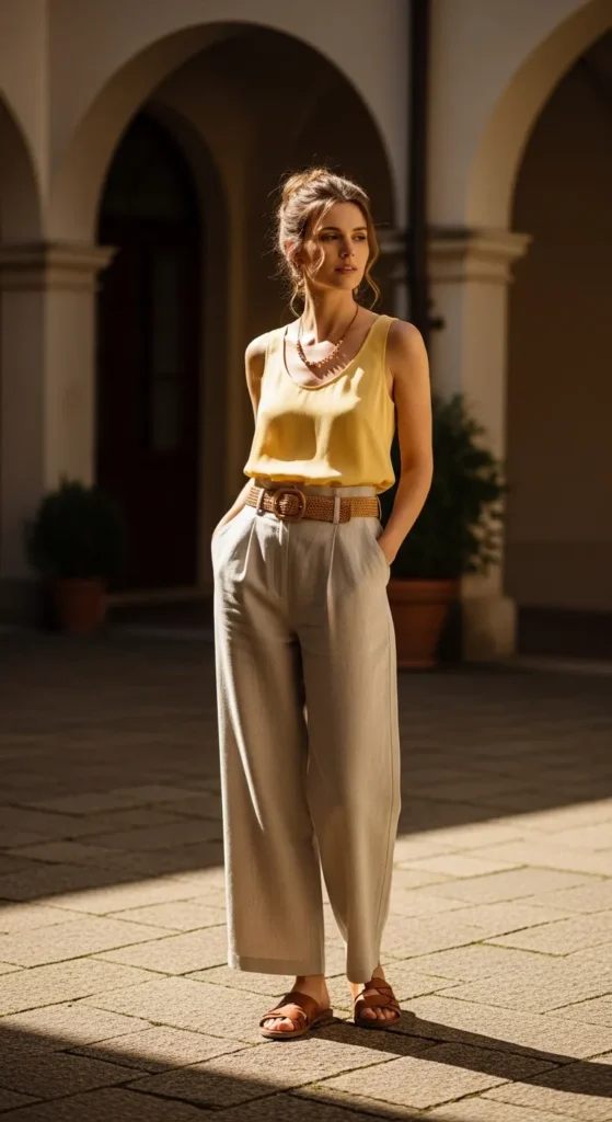 A simple yellow tank top paired with beige linen trousers creates a refined summer outfit that feels light and sophisticated. The neutral linen fabric balances the brightness of yellow beautifully.