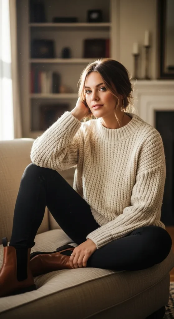 A chunky knitted sweater styled with classic leggings feels like a wearable hug. This outfit leans into comfort while still looking intentional, perfect for cozy days that stay mostly offline.