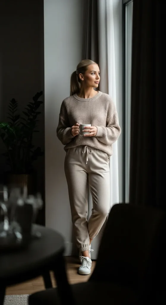 A knitted sweater paired with elevated joggers gives comfort-first energy without looking sloppy. This outfit feels relaxed, warm, and perfect for casual weekends or travel days.