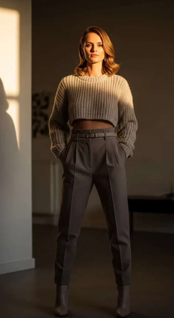 A slightly cropped knit sweater with high waisted bottoms feels playful yet warm. It’s cozy without heaviness, offering freedom of movement and a modern edge.