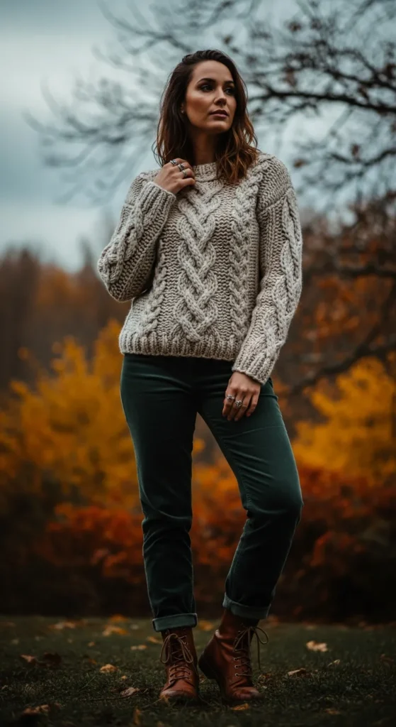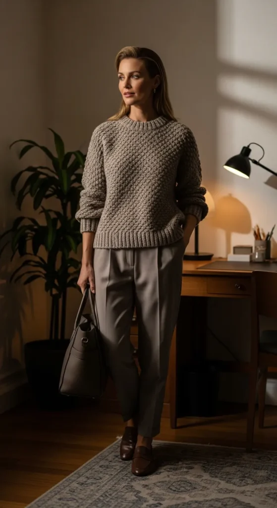 A textured knit sweater paired with loose trousers feels elevated yet relaxed. This outfit gives quiet confidence, blending warmth and ease for days that require comfort and presence.