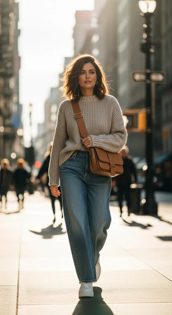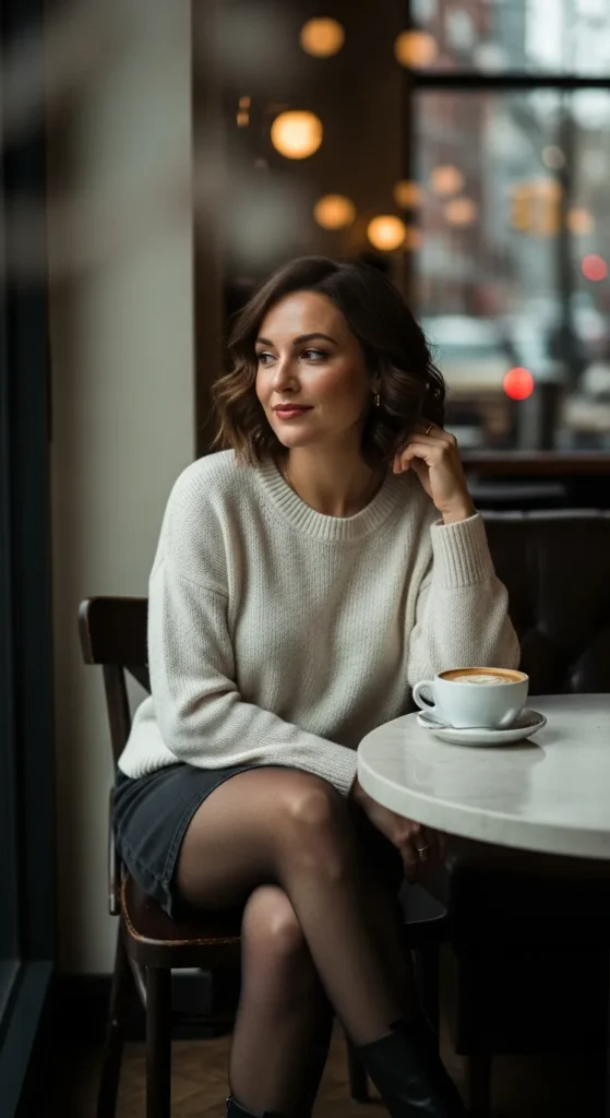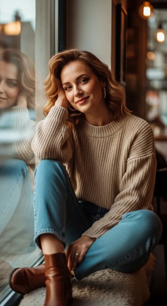 A soft neutral knitted sweater paired with straight leg jeans creates that slow morning energy. It feels calm, warm, and intentional, perfect for quiet coffee moments when you want comfort without looking undone.