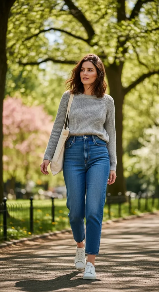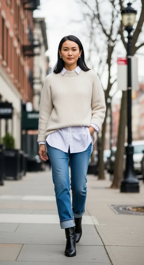 Layering a knit sweater under a casual coat adds depth and warmth. This outfit feels calm, confident, and perfect for everyday city wear.
