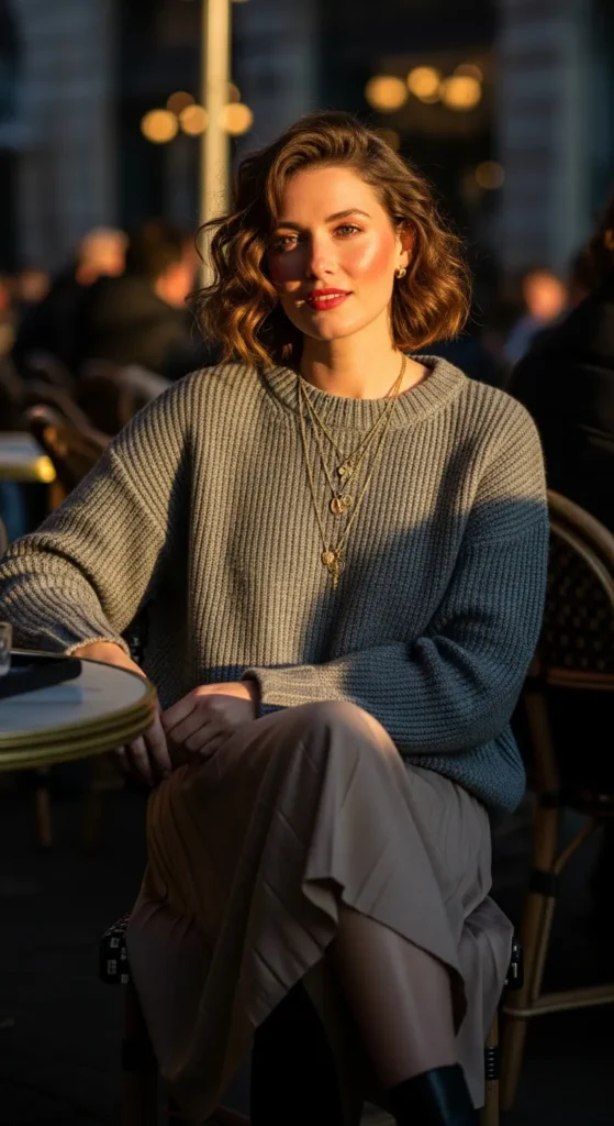 A warm knitted sweater tucked slightly into a midi skirt creates movement and softness. It feels feminine, calm, and perfect for slow walks or casual dinners.
