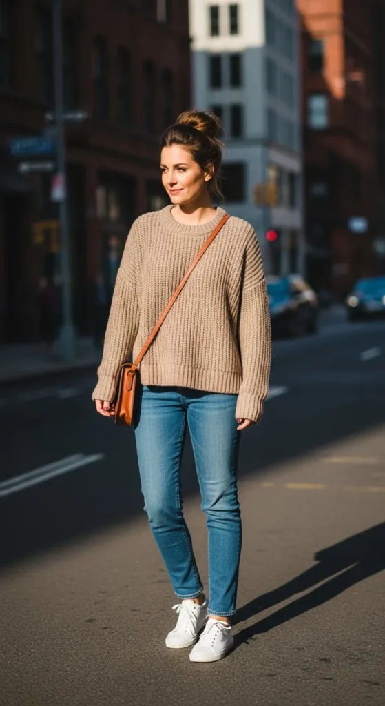 A simple knit sweater elevated with a cozy scarf adds warmth and personality. This look feels thoughtful, comfortable, and ideal for crisp outdoor moments.