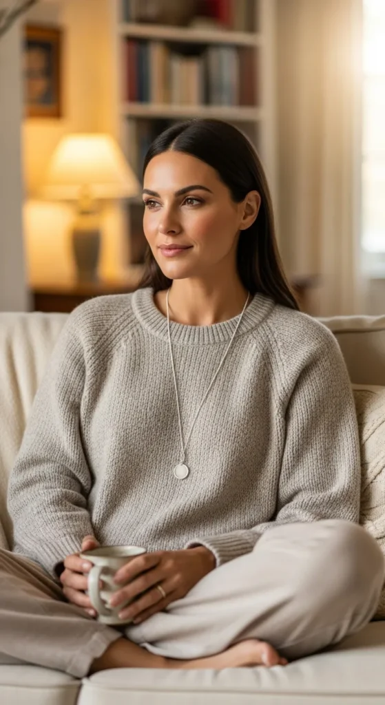 A soft knitted sweater with lounge style pants creates peak comfort without losing style. It’s perfect for cozy days that still deserve a put together look.
