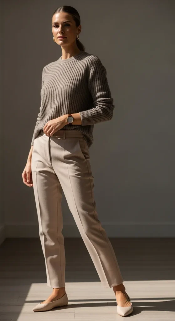 A fitted ribbed sweater paired with relaxed tailored pants creates a cozy meets polished balance. It feels intentional but comfortable, perfect for days when you want warmth without leaning too casual.
