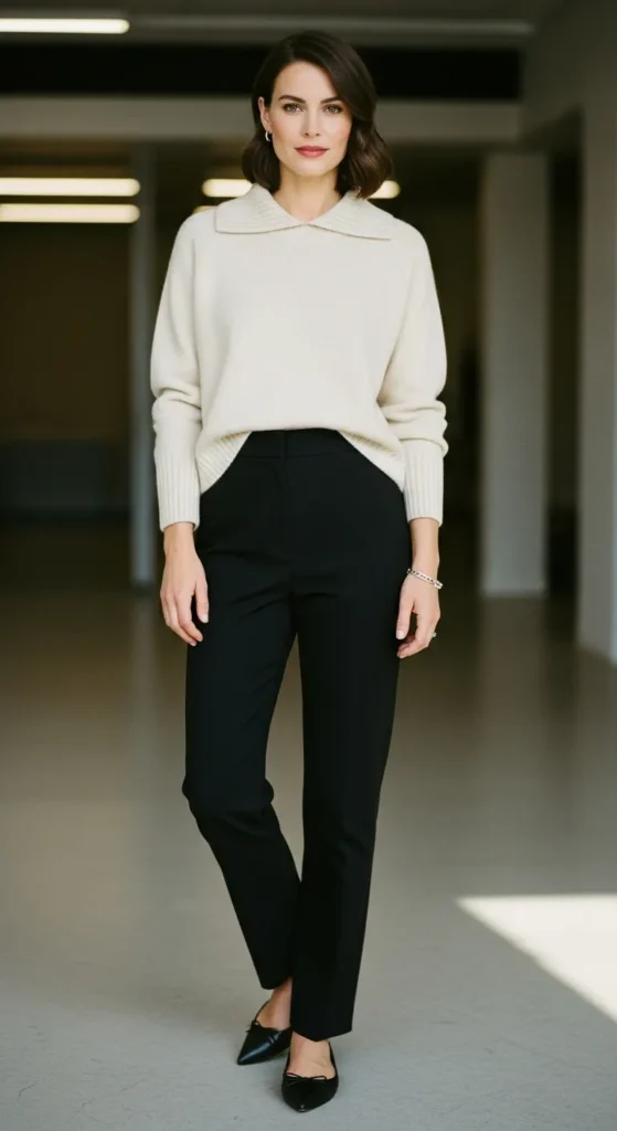 Stylist Suggestion: Opt for sleek loafers and a structured tote. The clean accessories contrast the knit’s texture, making the outfit feel intentional and suitable for casual workdays.