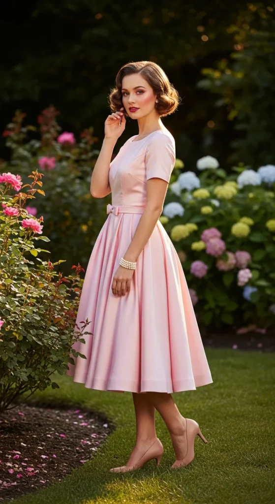 A baby pink tea-length dress with a subtle bow detail feels timeless and charming. The mid-calf length gives a classic tea-party vibe without feeling old-fashioned.