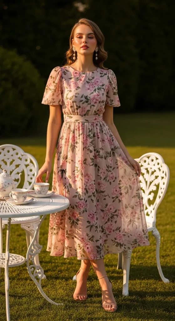 A blush floral midi dress with soft puff sleeves feels like it was made for sipping tea under blooming trees. The lightweight fabric flows gently with every step, creating a romantic, graceful silhouette that photographs beautifully.