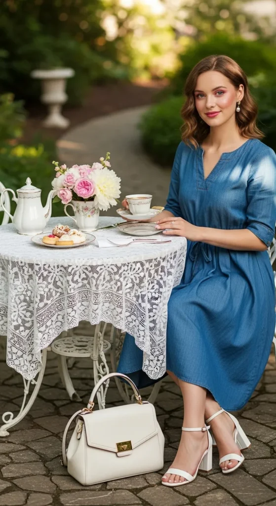 A chambray dress brings relaxed sophistication to a tea party. The soft denim-like texture feels approachable while still looking polished and photo-ready.