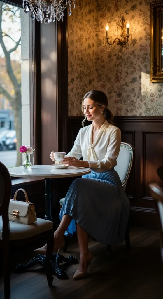 A powder blue pleated skirt paired with a soft ivory silk blouse creates movement and shine in the most graceful way. It feels polished yet still light enough for a relaxed afternoon tea.