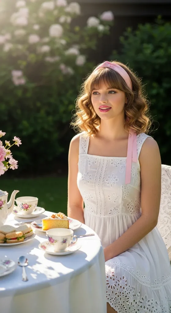 Stylist Suggestion: Choose pastel ribbon flats and a matching headband. The soft color ties everything together and keeps the look playful yet refined, especially for outdoor brunch-style tea parties.