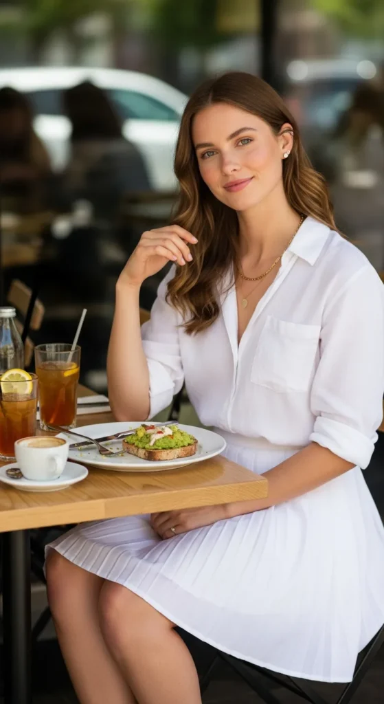 A lightweight linen shirt loosely tucked into a tennis skirt feels breathable and relaxed, ideal for hot summer days when comfort and effortless style matter most.