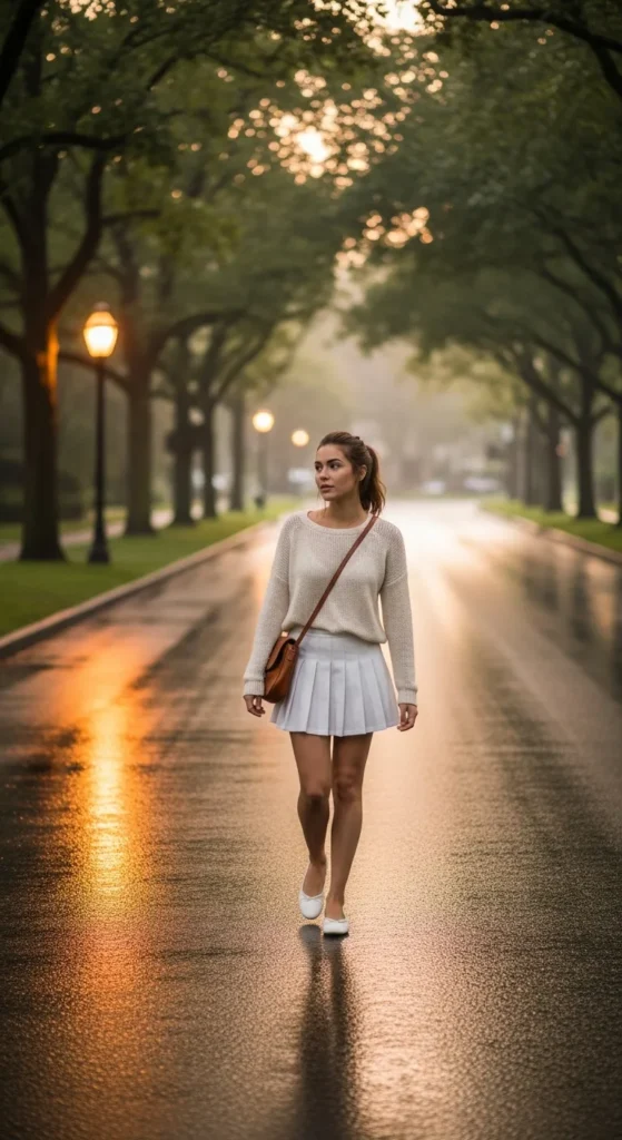 A lightweight cropped knit paired with a tennis skirt feels cozy yet breathable, blending sporty charm with soft texture for days when you want to feel relaxed but still intentionally styled.