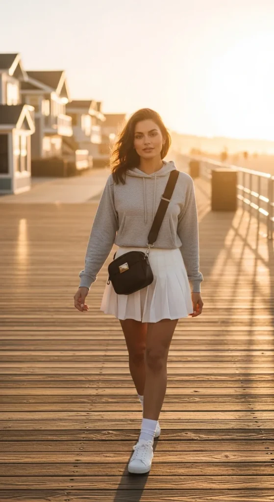 A cropped or lightweight hoodie with a tennis skirt creates a relaxed summer outfit for breezy evenings, mixing comfort and style in a way that feels laid-back but still put together.