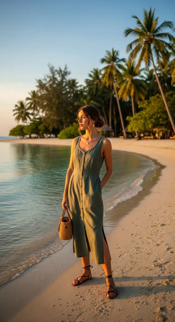 Stylist Suggestion: Add a straw crossbody bag and flat espadrilles. The natural textures echo the island setting and make the outfit feel cohesive while staying practical for walking on sandy paths.