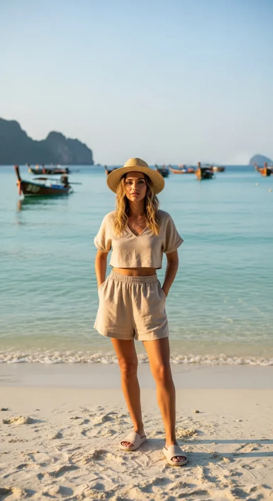 A neutral ribbed tank tucked into high-waisted linen shorts creates a clean, minimal island look. It’s comfortable for boat tours yet stylish enough for grabbing fresh mango smoothies afterward.