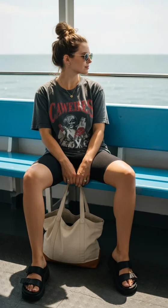 An oversized breathable tee paired with soft biker shorts is ideal for travel days between islands or ferry rides.