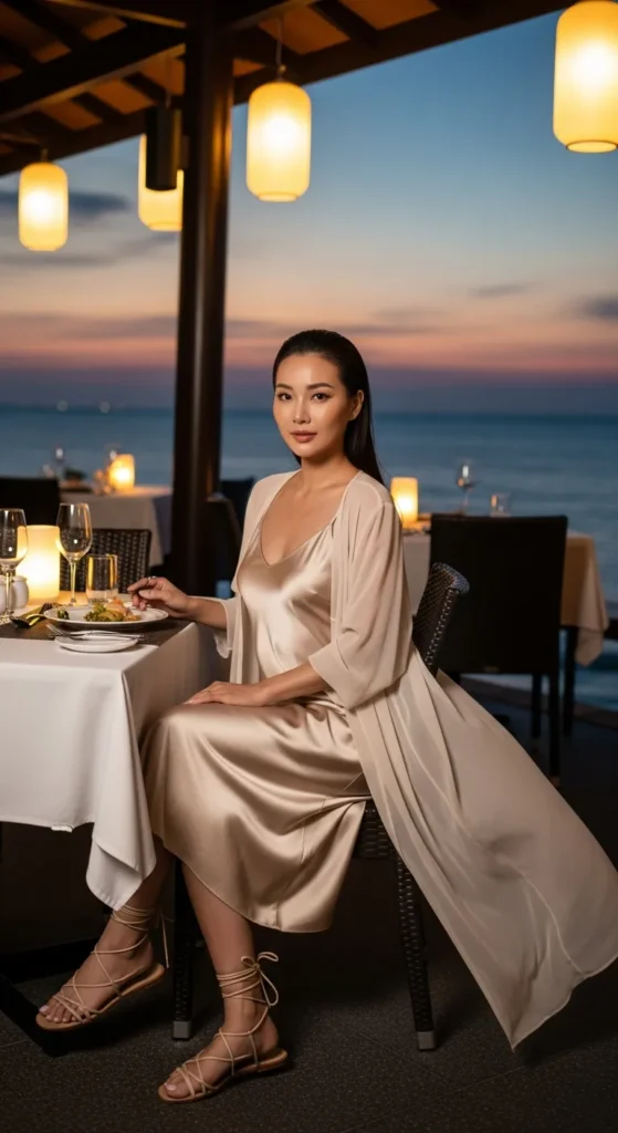 A satin slip dress layered with a gauzy cover-up creates that dreamy island evening look without feeling too formal.