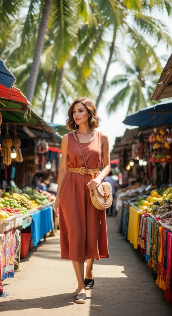 A breathable cotton sundress in warm sunset tones feels effortless for island cafés and beach hopping. The woven belt defines your waist without restricting you in Thailand’s humid air.